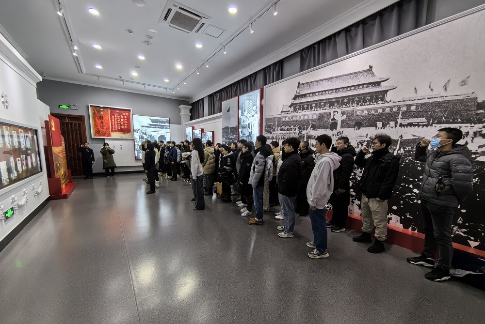 參觀結束后,黨群科發黨支部書記熊照旭同志主持了新黨員入黨宣誓儀式。學生黨支部書記和黨群科發黨支部支委分別為新發展黨員佩戴黨員徽章。隨后,在莊嚴的黨旗下,黨群工作辦公室主任王海波同志帶領新發展黨員面向鮮紅的黨旗,右手握拳,鄭重宣誓,其他黨員同志也一起重溫入黨誓詞。錚錚誓言,震撼人心,響徹現場,詮釋著每一位黨員對黨的無限忠誠與堅定信仰。