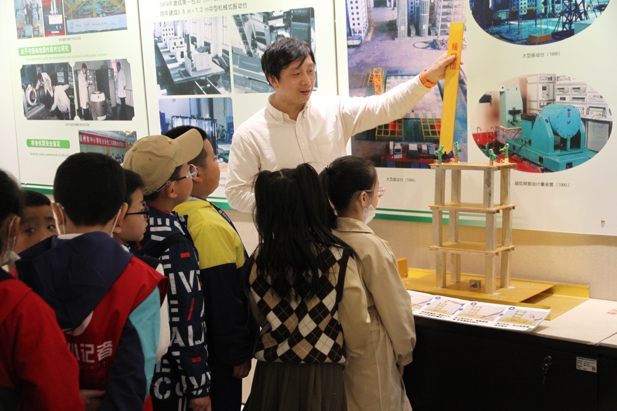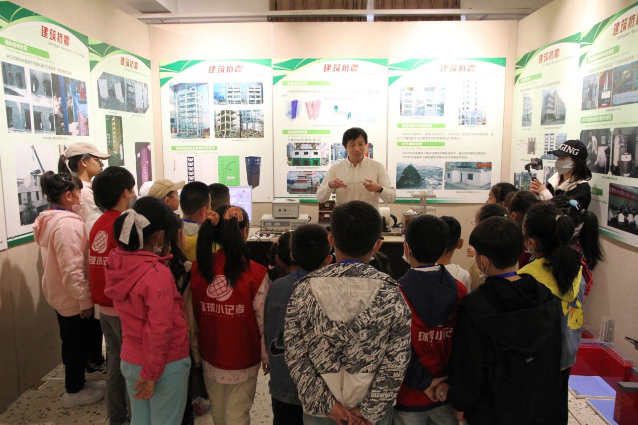 講座結(jié)束后,張昊宇副研究員帶領(lǐng)小記者們參觀并實(shí)踐了一系列的科普實(shí)驗(yàn)。來到鐵路地震監(jiān)測預(yù)警系統(tǒng)展臺,了解地震后該系統(tǒng)如何保障高鐵安全運(yùn)行的原理。通過學(xué)習(xí)和思考,小記者們提出許多問題,例如“中國古建筑為何能夠跨越千年不倒”,張昊宇結(jié)合提問講解了中國傳統(tǒng)木結(jié)構(gòu)的抗震機(jī)理知識。最受小記者們歡迎的還是微型振動臺模擬實(shí)驗(yàn)和搖擺墻結(jié)構(gòu)無損倒塌模型實(shí)驗(yàn)。每一位小記者都親手操作搖擺墻結(jié)構(gòu)無損倒塌模型,近距離直觀地認(rèn)識到不同建筑結(jié)構(gòu)抗震能力的強(qiáng)弱區(qū)別,學(xué)習(xí)了建筑結(jié)構(gòu)抗震的基本知識。