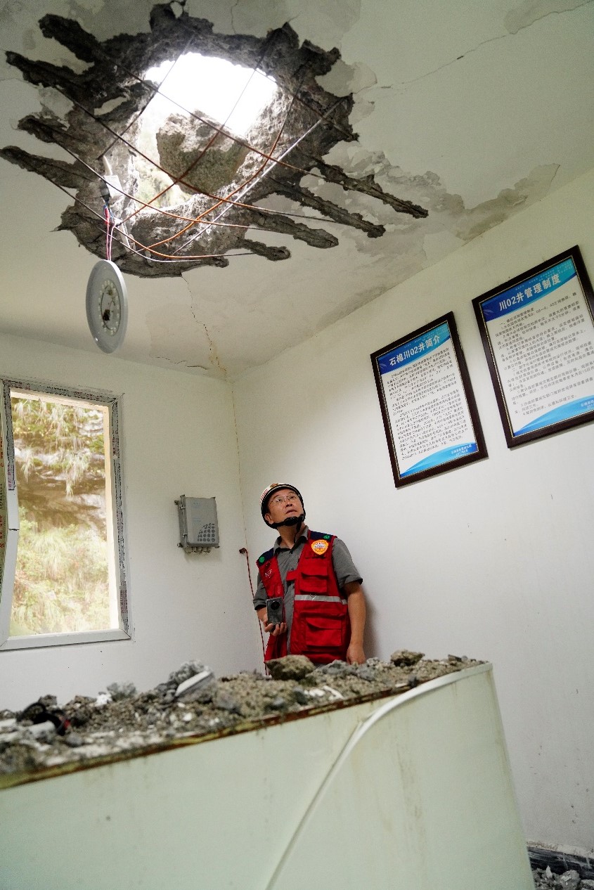 石棉線科考組圍繞石棉川02井、擦羅強(qiáng)震臺(tái)站、栗子坪強(qiáng)震臺(tái)站開(kāi)展了周邊建筑震害調(diào)查。該區(qū)域儀器烈度與實(shí)際建筑破壞程度基本相符,考察區(qū)域的大部分震害為非結(jié)構(gòu)構(gòu)件的破壞,如框架結(jié)構(gòu)填充墻開(kāi)裂、瓷磚脫落等。科考組考察到的2008年汶川地震后援建的中小學(xué)校舍在此次地震中表現(xiàn)良好,幾無(wú)震害。個(gè)別房屋出現(xiàn)了屋蓋和墻壁被落石直接擊穿的震害。