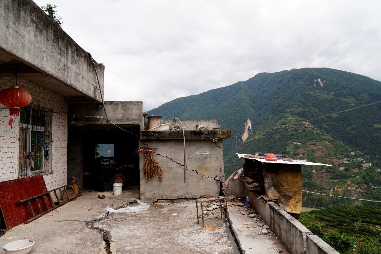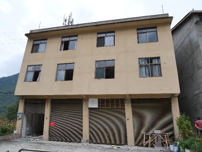 石棉線科考組(戴君武、周寶峰、柏文)圍繞51SMX,SC-T2471,51SMM等強震臺站,開展周邊建筑震害調(diào)查。SC-T2471臺站在本次地震中記錄到的加速度記錄峰值最大,現(xiàn)場考察發(fā)現(xiàn)該臺站位于山包之上,地形對其地震響應具有較為明顯的放大作用。此外,地基失效是造成房屋破壞的重要原因,由于山地地形限制,部分民房建于山坡上,地震時結(jié)構(gòu)基礎土體沿山坡向下發(fā)生滑動,造成基礎局部失效,進而引起上部結(jié)構(gòu)破壞。
