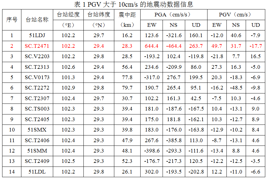和歷史地震相比,本次地震記錄到的地震動(dòng)PGV/PGA明顯偏大。2008年汶川8.0級地震臥龍臺(tái)站記錄到的地震動(dòng)PGA為957.7cm/s2,PGV為51.7cm/s。2019年四川宜賓長寧地震珙縣中學(xué)臺(tái)站記錄到的地震動(dòng)PGA為600cm/s2,PGV為12.6cm/s。本次地震,記錄到的最大地面加速度峰值PGA為644.4cm/s2,PGV高達(dá)49.7cm/s,與汶川地震臥龍臺(tái)站記錄到的PGV值十分接近,可見此次地震的破壞能量之大。