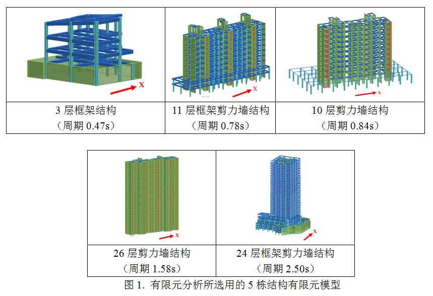 為評估結(jié)構(gòu)在此次地震動(dòng)的破壞水平,選取了實(shí)際記錄到的儀器烈度對應(yīng)的5組強(qiáng)震記錄,開展了針對當(dāng)?shù)乜拐鹪O(shè)防烈度為8度0.2g的5棟典型鋼筋混凝土結(jié)構(gòu)房屋的非線性動(dòng)力響應(yīng)時(shí)程分析。5棟結(jié)構(gòu)包括1棟框架、2棟框剪及2棟剪力墻,結(jié)構(gòu)基本周期從小到大分別是0.47s,0.78s,0.84s,1.5s和2.5s。分析主要給出了對結(jié)構(gòu)安全和建筑內(nèi)人員體感影響明顯的層間相對位移和樓層加速度響應(yīng)結(jié)果。表2為選取的地震動(dòng)記錄相關(guān)信息。圖1為選取的5棟結(jié)構(gòu)的有限元模型示意圖,圖2至圖6為五棟結(jié)構(gòu)的初步分析結(jié)果。