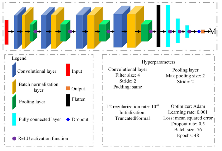 (1)人工智能震級估算:采用基于川滇數(shù)據(jù)遷移學習后的人工智能DCNN-M模型進行實時震級估算,目前該模型已在福建局、四川局在線運行。DCNN-M模型使用從P波到達后記錄的3s地震數(shù)據(jù)中提取的12個參數(shù)作為輸入,并且該模型由四個卷積層、四個池化層、四個Batch normalization層、三個全連接層、Adam優(yōu)化器和一個輸出層組成。圖2展示了DCNN-M模型的網(wǎng)絡(luò)架構(gòu)。