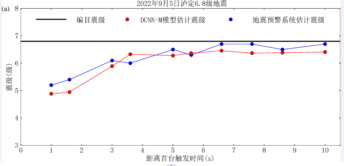 圖3展示了人工智能DCNN-M震級估算結(jié)果隨時間變化的過程,可以看到,在此次瀘定6.8級地震中,首臺觸發(fā)后1秒人工智能與傳統(tǒng)震級估算模型都可以給出震級估算結(jié)果,首臺觸發(fā)2秒后人工智能震級估算結(jié)果上升速率較傳統(tǒng)震級估算模型更快,首臺觸發(fā)后3.5秒人工智能震級估算結(jié)果為6.2級、較傳統(tǒng)震級估算模型更接近編目震級,隨后人工智能震級估算結(jié)果知道首臺觸發(fā)后10秒都穩(wěn)定在6.3級,與傳統(tǒng)震級估算模型相當。