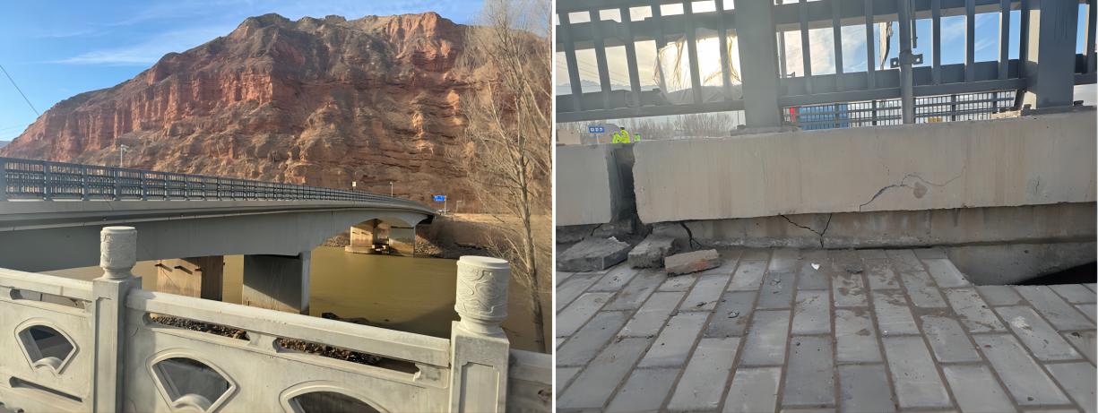 調(diào)查簡述:大河家黃河大橋舊橋?yàn)殇摌?gòu)橋,橋梁主體橋墩、梁未發(fā)現(xiàn)明顯裂縫,在兩端橋臺(tái)發(fā)生嚴(yán)重破壞,梁端擋快由于碰撞發(fā)生沿?fù)蹩斓男绷芽p;橋面局部護(hù)欄發(fā)生較大尺寸外閃;大河家黃河大橋新橋?yàn)檫B續(xù)梁橋,橋梁主體橋墩未發(fā)現(xiàn)明顯裂縫,梁體在甘肅側(cè)橋臺(tái)處發(fā)生碰撞,局部梁體產(chǎn)生可見裂縫,伸縮縫處縫隙加大,且向青海側(cè)滑移3cm左右;橋梁青海一側(cè)橋臺(tái)發(fā)生嚴(yán)重裂縫,裂縫寬度5cm左右。梁體有逆時(shí)針轉(zhuǎn)動(dòng)傾向。在大河家黃河大橋旁邊的廣場有一個(gè)簡支梁公路橋,該橋主體完好,在橋臺(tái)處欄桿有外閃,以及橋面與路面的撞擊裂縫。