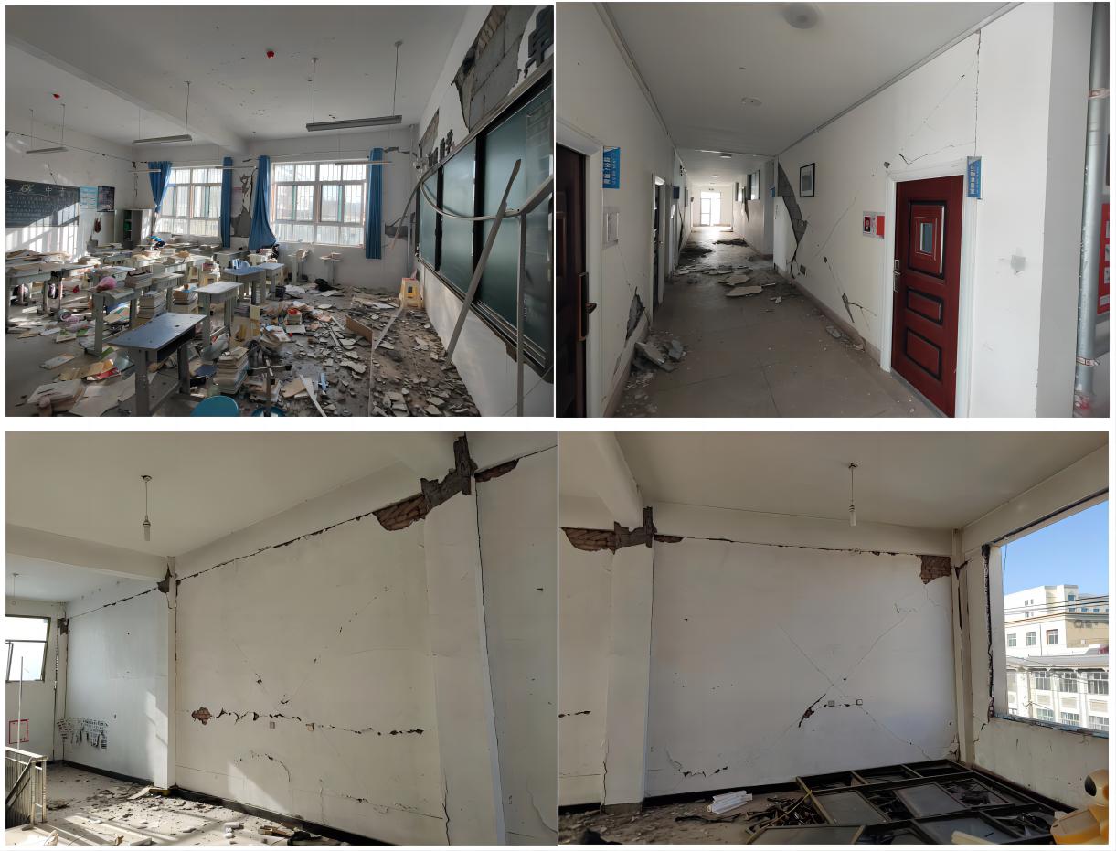 1.調(diào)查大河家中學(xué)教學(xué)樓、實(shí)驗(yàn)樓、食堂和學(xué)生宿舍的震害情況。其中,4個(gè)結(jié)構(gòu)的結(jié)構(gòu)構(gòu)件均無明顯破壞,非結(jié)構(gòu)構(gòu)件砌體填充墻、吊頂破壞嚴(yán)重。雖無倒塌風(fēng)險(xiǎn),但使建筑的使用功能中斷。