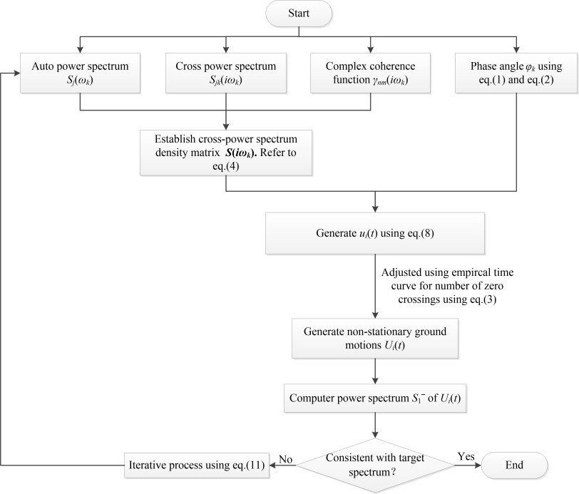 地震動的頻域非平穩(wěn)性可通過累積穿零量隨時間變化進(jìn)行描述,在傳統(tǒng)譜表達(dá)合成地震動的基礎(chǔ)上分別引入相位差譜和累積穿零量對合成結(jié)果進(jìn)行強度、頻域非平穩(wěn)化。利用CESMD數(shù)據(jù)庫中豐富的地震動記錄擬合出相位差譜隨震級、震中距變化模型,以及累積穿零量隨時間變化的經(jīng)驗?zāi)P停俅肟臻g相干函數(shù)拓展為多點非平穩(wěn)地震動,改進(jìn)后方法流程如圖1。由圖2可知,所模擬的地震動時程不僅具有強度及頻域非平穩(wěn)性,同時體現(xiàn)了空間多點的相干性。將上述合成的地震動通過一大跨橋梁進(jìn)行多點地震動輸入驗證,討論了一致和非一致輸入下的結(jié)構(gòu)響應(yīng)差異。