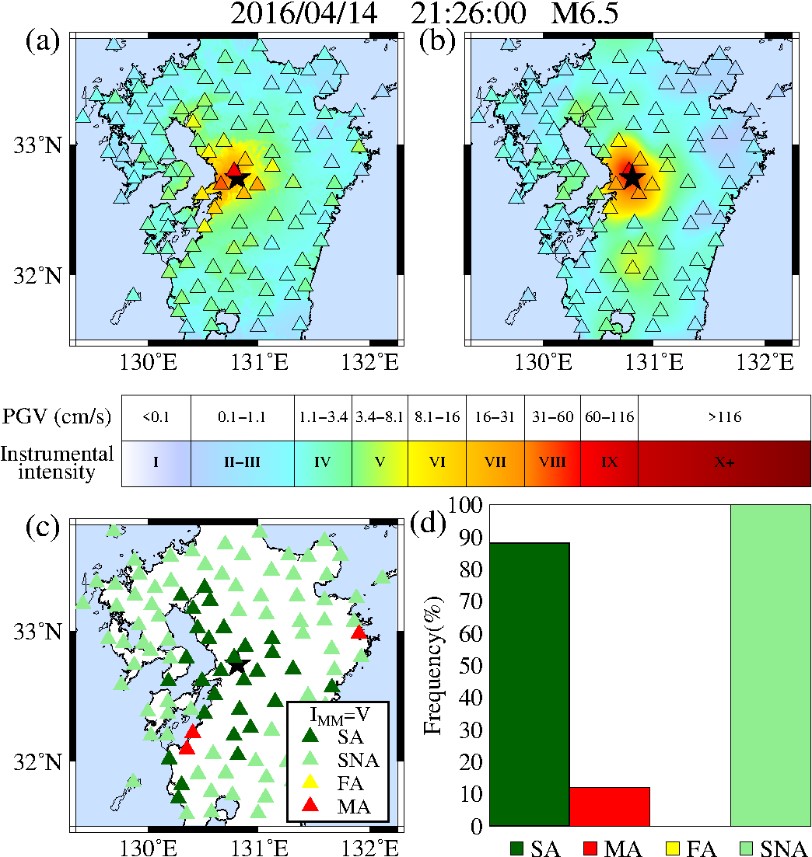 研究方法及結(jié)果: 1)我們提出了一個由RNN特征提取塊組成的混合深度學習網(wǎng)絡(PGV。模型采用單個臺站的多個物理特征時間序列、地震原始波形和場地特征PGV相關(guān)的信息。本研究利用日本2007-2019年記錄到的地震動記錄建立訓練集和測試集對1展示了HybridNet模型預測的現(xiàn)地PGV與地震潛在破壞(儀器烈度)之間的關(guān)系,通過對預測的
