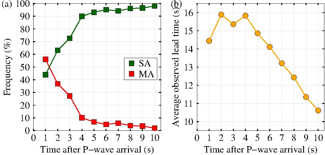 5次地震事件,在潛在破壞場地中,圖P波到達后時間窗的關(guān)系。從圖a)中可以看到:隨著P波到達后60%。此外,在10秒時,成功報警率超過2%。從圖b)中可以看到:當在4秒內(nèi),平均觀測預警時間超過P波到達之后時間的增加而逐漸減小。在10秒時,平均觀測預警時間仍超過