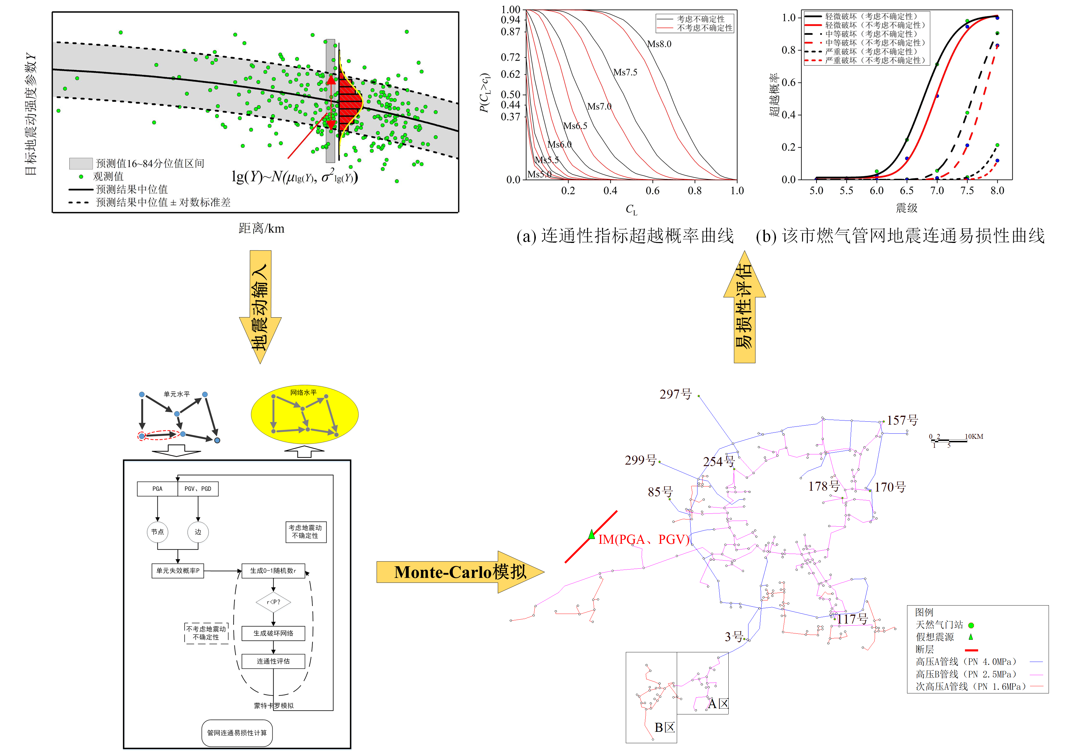 發布時間: 2022-07-29 點擊數量:5897(1)以地震動預測方程(GMPE)作為燃氣管網地震動輸入依據,同時采用正態分布抽樣模擬隨機誤差變量的分布以體現地震動的不確定性,從單元失效擴散至網絡失效,給出了基于Monte-Carlo模擬方法的城市燃氣管網地震連通易損性分析流程。并以我國華北某城市為例,應用該流程對該市燃氣管網的地震連通易損性進行了分析,驗證了該流程的適用性,同時對網絡地震動輸入時是否考慮地震動不確定性對連通易損性評估結果的影響進行了對比研究,結果表明:地震動不確定性在評估城市燃氣管網的抗震能力時有削弱作用,不可忽視其對結果的影響。銜接該流程可進一步完善燃氣管網抗震韌性定量評估方法。相關技術細節可查閱發表在《哈爾濱工業大學學報》上的論文。