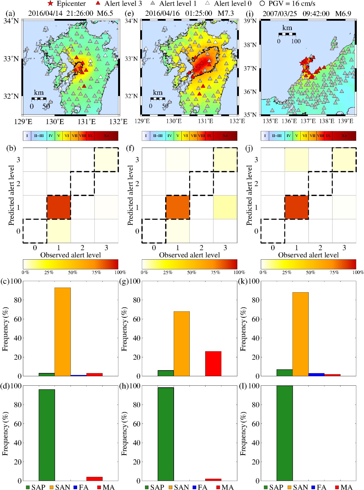 圖2 三次大地震事件的警報(bào)水準(zhǔn)預(yù)測(cè)與性能分析