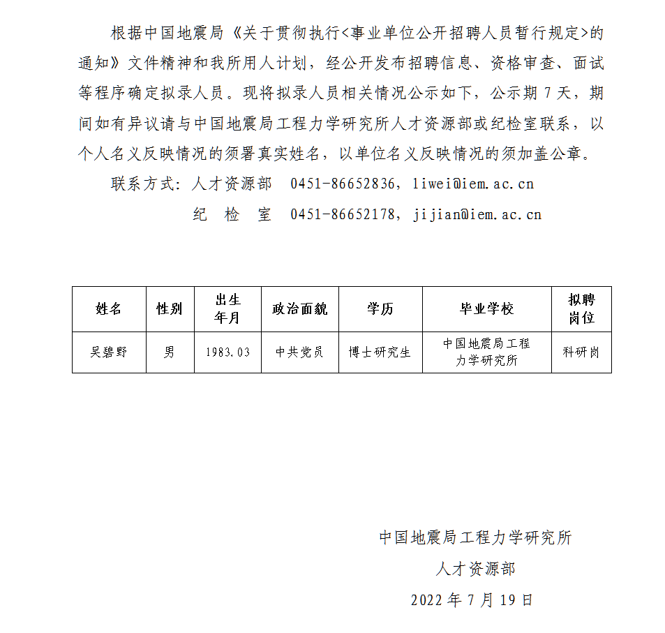 中國地震局工程力學研究所2022年擬錄用人員公示(四)