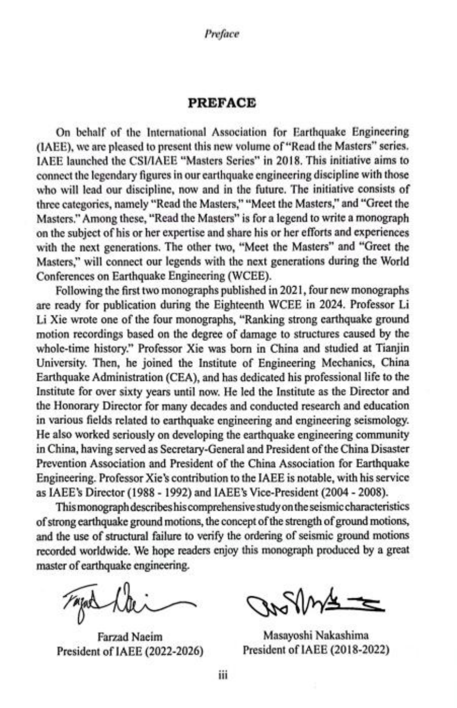 國際地震工程協會為謝禮立院士出版的專著封面 IAEE本屆主席和上屆主席共同為專著撰寫的前言